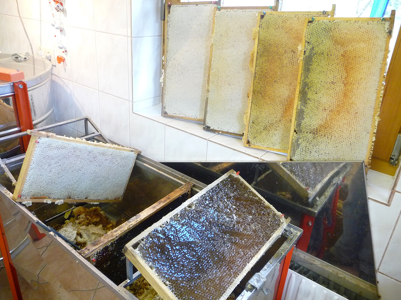 Die Honigwaben werden von den Bienenstöcken genommen und mit Leerwaben ersetzt. Zu Hause im Schleuderraum werden die Waben entdeckelt, (die Wachsschicht von den Zellen entfernt) und dann gechleudert. Der Honig wird mehrfach gesiebt und einige Tage ruhend gelassen, damit sich die kleinen Lufteinschlüsse zu einer Schaumschicht oben sammelt.